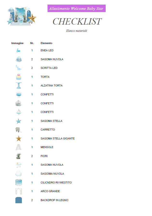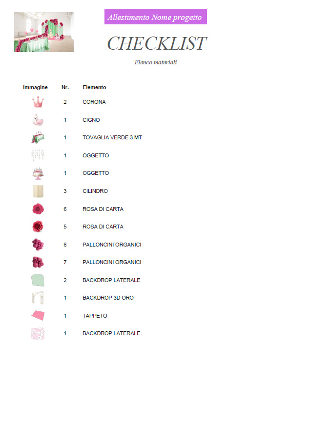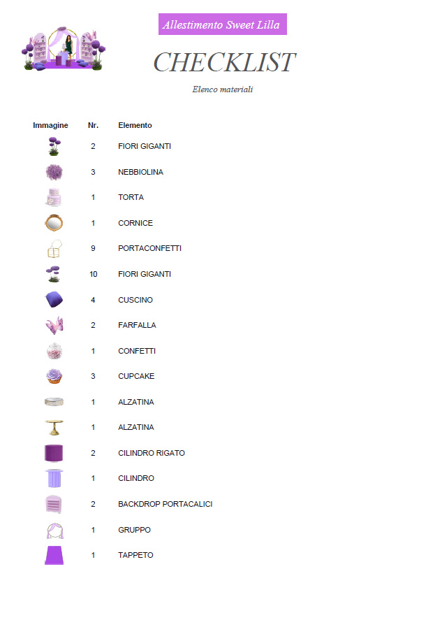 La Checklist automatica di Bozzetto Digitale si basa sul progetto creato e genera l’elenco preciso di materiali, elementi e quantità. È uno strumento fondamentale per organizzare l’allestimento dell’evento e per elaborare preventivi chiari e coerenti. Puoi stamparla o consultarla in fase operativa, lavorando in modo ordinato e senza imprevisti.